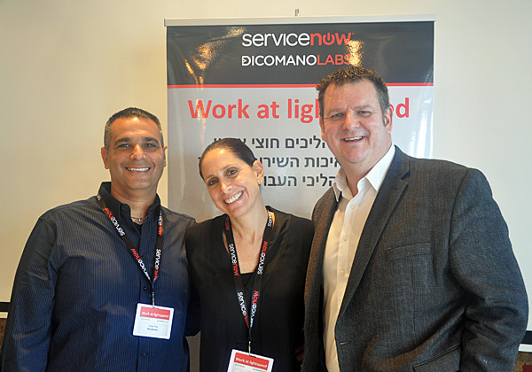 מימין: כריס פופ, סמנכ"ל החדשנות של ServiceNow; לימור אפיק, מנהלת אזורית ב-ServiceNow; וגילי סהר, מנכ"ל דיקומנו לאבס. צילום: יח"צ