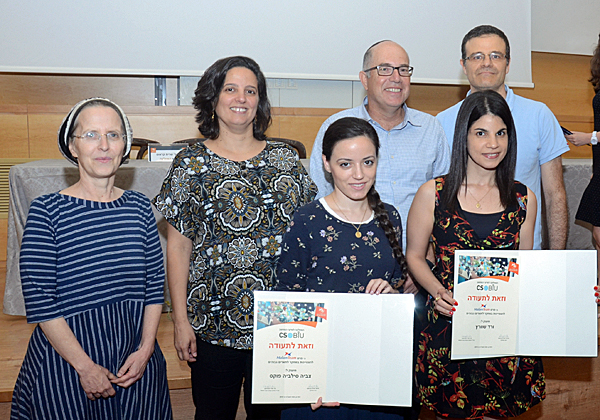 מאחור: מימין – פרופ' ליעם רודיטי, סגן ראשת המחלקה למדעי המחשב באוניברסיטת בר אילן; אודי וינטראוב, מנכ"ל משותף של מלם תים; דורית בר, סמנכ"לית משאבי האנוש של הקבוצה; ופרופ' שרית קראוס, ראשת המחלקה. מלפנים: מימין – ורד שוורץ וצביה סילביה פוקס, מקבלות התואר. צילום: יח"צ