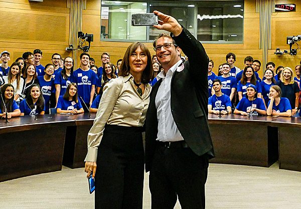 מימין: אבירם סושרד, מנכ"ל הפעילות המסחרית של פיליפס מערכות רפואיות בישראל, וח"כ רויטל סוויד, סגנית יו"ר הכנסת, עם התלמידים בביקור בכנסת. צילום: צבי רוגר