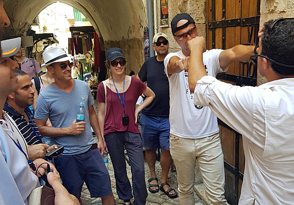 אופיר עקיבא, מדריך הקבוצה מחברת דיונה, מסביר בסמטאות העיר העתיקה לחברי הצוות: שי ונסובר, מנהל מכירות אזורי; משה ריבל, מנהל מכירות בכיר לתחום הטכנולוגיה באזור EMEA; קטיה הולמקויסט, מעצבת ראשית; עופר טל, מנהל פריסייל ישראל; ואיתי ויסמן, מוביל צוות הנדסת פתרונות. צילום: יח"צ