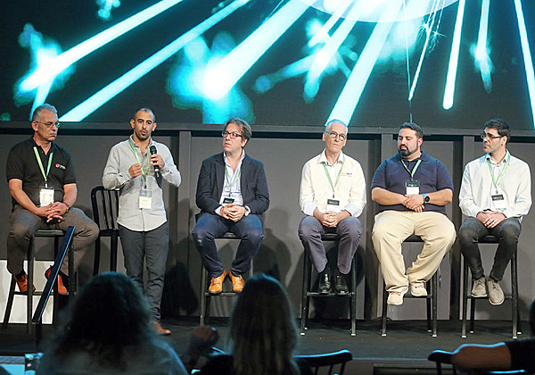 פאנל שותפי זהב. מימין: אריק מורנו, מומחה vSAN אזורי ב-VMware; ניר שילוני, ארכיטקט פתרונות ב-תים; מארק פרידמן, CTO ב-TeraSky; מאסימיליאנו קפוצ'טי, מנהל פריסייל בקוואנטום; חן ראובן, מנהל פתרונות בכיר בנט-אפ; ו-ולדימיר זבודשיקוב, מהנדס מכירות בטרנד מיקרו ישראל. צילום: ניב קנטור