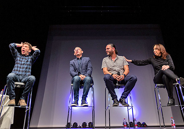 טלי אורן, אלי גלפרין ועידן אלתרמן מקבלים שיעור בסטנדאפ ממנכ"ל איטרניטי, אסף בר, וגם נותנים לו כמה טיפים. צילום: ניר אלון