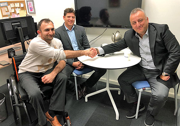 מימין: יקוב בורקיוגלו, מנהל אזורי בטרנד מיקרו, לוחץ את ידו של יוני יונתן, מנהל אבטחת המידע של ספייאנס. באמצע: צביקה בן נון, מנהל מכירות בטרנד מיקרו ישראל. צילום: יח"צ
