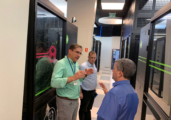 הבכירים בביקור בחוות השרתים של בזק בינלאומי. נתי כהן, מנכ"ל משרד התקשורת, בחולצה הירוקה, ורן גוראון, מנכ"ל בזק בינלאומי, פלאפון ו-yes – בחולצת התכלת. צילום: יח"צ משרד התקשורת