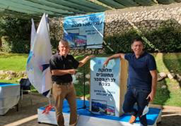 מחלקים מחשבים בצפת. מימין: ד"ר עופר רימון, סמנכ"ל תקשוב במשרד החינוך, אבי ביגל, מנהל הפרויקט מטעם הראל טכנולוגיות מידע. צילום: אבי ביגל