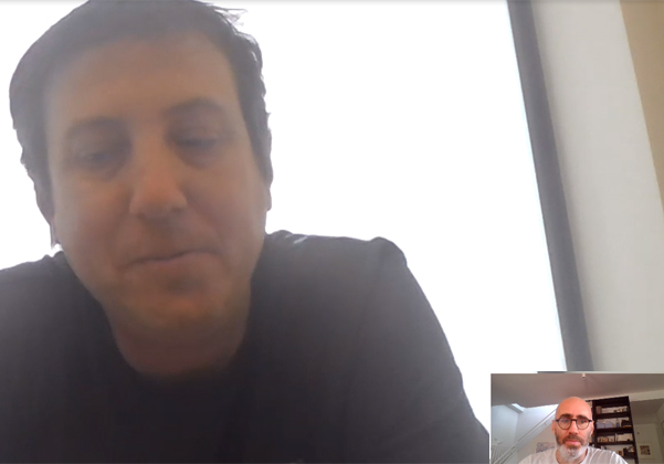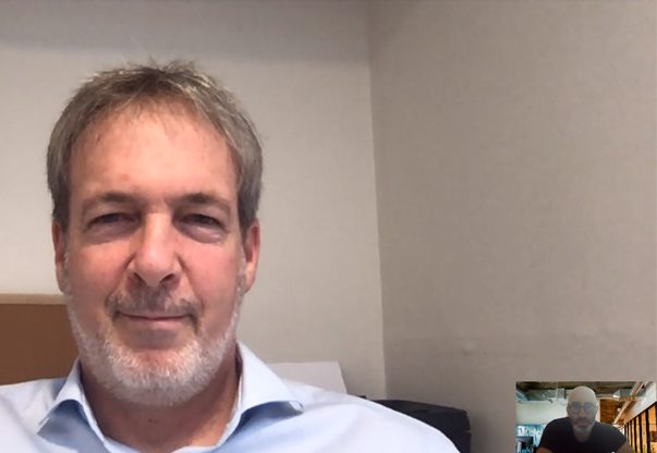 הודעה משמחת בזום משחר פרידמן, מנהל סטודיו החדשנות של ויזה בישראל (בתמנה הקטנה) למידד שרון, מייסד ChargeAfter. צילום: יח"צ