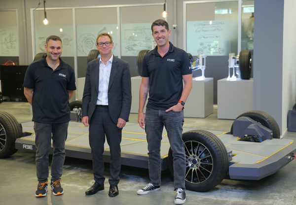 שגריר בריטניה בישראל, ניל וויגן (במרכז), עם מייסדי REE Automotive, דניאל בראל ואחישי סרדס. צילום: רן מאיר