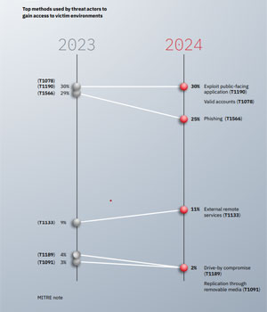 השיטות המרכזיות ששחקני האיום השתמשו בהן כדי להשיג גישה לסביבות של הקורבנות שלהם. מקור: יבמ
