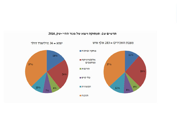 נתונים נוספים מראים שמספר השכירים בהיי-טק עלה בשנה המדווחת, 2014, ל-283,300, והם מהווים 12.1% מכלל השכירים במגזר העסקי בארץ. 37% מכלל השכירים בהיי-טק מגיעים ממגזר התוכנה, 26% מהאלקטרוניקה והמחשבים, 12% מהתקשורת, 11% מהמחקר והפיתוח והיתר מכלי הטיס ומהתרופות.