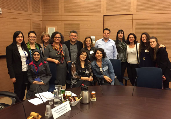 חלק ממשתתפי ומשתתפות הדיון אתמול (ב'), ביניהם: סמדר נהב, מייסדת צופן (עומדת, שנייה משמאל), ומשמאלה: אביטל ינובסקי, צופן; ח"כ עאידה תומא-סלימאן, יו"רית הוועדה לקידום מעמד האישה ושוויון מגדרי; וח"כ יוסף ג'בארין. חמישי מימין: ח"כ איימן עודה, ראש הרשימה המשותפת. צילום: צופן