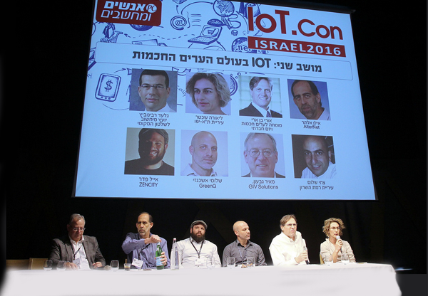 מימין לשמאל: ליאורה שכטר, מנהלת מערכות המידע של עיריית תל אביב; אורי בן ארי, מומחה לערים חכמות ויזם חברתי; שלומי אשכנזי, מנכ"ל, GreenQ; אייל פדר, מנכ"ל, ZenCity; אילן אלתר, מנכ"ל אלתרנט; ומאיר גבעון, מנכ"ל Giv solutions. צילום: ניב קנטור