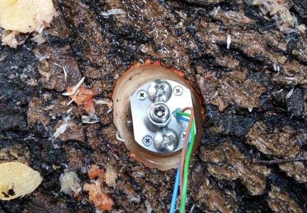 איך זה פועל? החיישן מוטמע בגזע העץ ובאמצעות מערכת תקשורת אינטרנטית מספק מידע מדויק להשקיה מותאמת לצרכים.