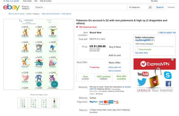 תופסי פוקימונים עצלים שחפצים בקיצור דרך כדי להפוך למאמני פוקימונים, יכולים לרכוש חשבונות כאלה ב-eBay.