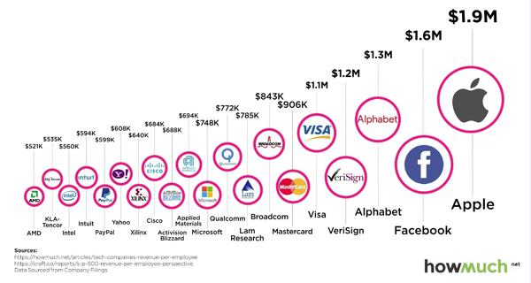 חברת הסקרים HowMuch ו-Visual Capitalist, המנתחת ומרכזת בצורה מובנת לעין מגוון נתונים עסקיים, פרסמו את רשימת 20 חברות הטכנולוגיה בהן העובדים תרמו הכי הרבה להכנסות החברה.