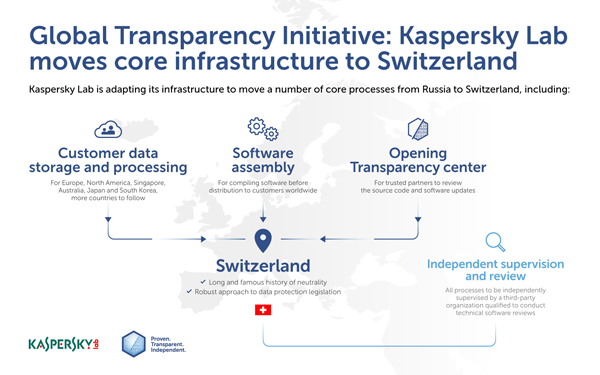קספרסקי (Kaspersky) מבצעת שינויים בתשתית ומעבירה כמה מתהליכי הליבה שלה מרוסיה לשוויץ. תהליכים אלה כוללים אחסון ועיבוד של נתוני לקוחות ברוב האזורים, וכן הרכבת תוכנה (Software assembly) – לרבות עדכונים של זיהוי איומים.