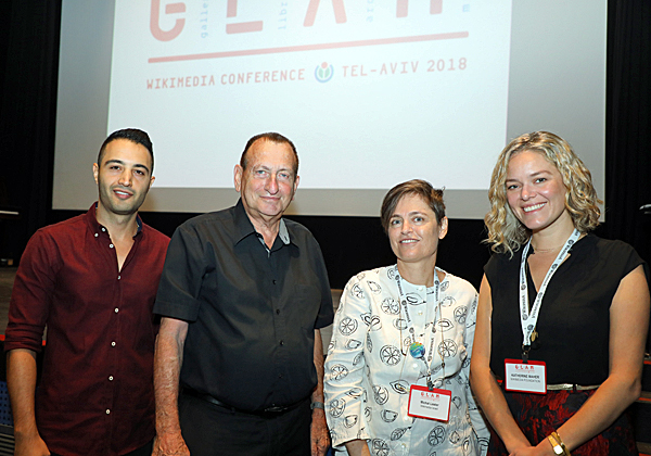 ראש עיריית תל אביב-יפו, רון חולדאי, עם מנכ"לית ויקימדיה העולמית, קתרין מאהר (מימין), מנכ"לית ויקימדיה ישראל, מיכל לסטר, ויו"ר ויקימדיה ישראל, איציק אדרי. צילום: סיוון שחור