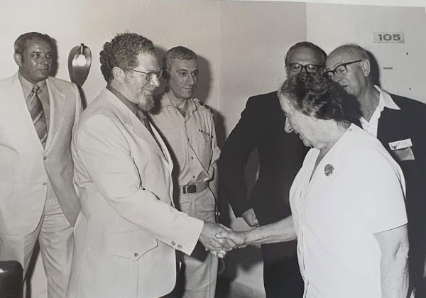 ראשת הממשלה, גולדה מאיר, לוחצת ידיים. ברקע נראה אל"מ מנחם דישון, מפקד ממר"ם הצבאי הראשון, אחרי קיקיון, המפקד האזרחי הראשון