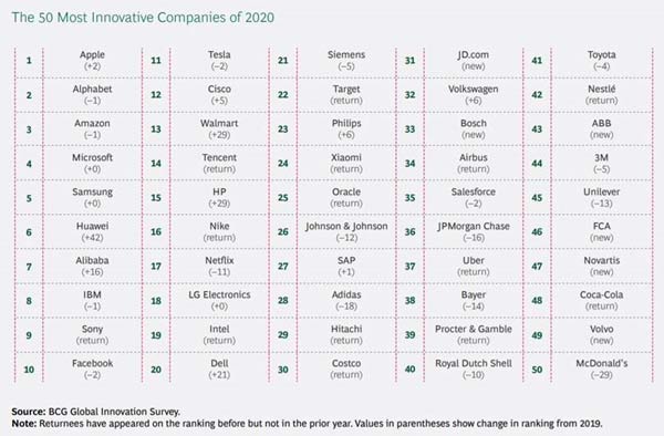 זוהי השנה ה-14 ברציפות שבה מפרסמת בוסטון קונסלטינג גרופ את הרשימה, שכוללת 50 חברות. כל 10 החברות הראשונות הן מעולם ההיי-טק – בהמשך נמצאות וואווי, שרושמת זינוק של 42 מקומות; עלי באבא, שעולה 17 מקומות; יבמ; סוני, שחוזרת לדירוג אחרי היעדרות; ופייסבוק, שסוגרת את העשירייה הראשונה עם ירידה של שני שלבים ביחס לדירוג אשתקד.