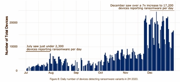 מספר יומי של מכשירים שאיתרו גרסאות כופרה במהלך המחצית השנייה של 2020. אינפוגרפיקה: פורטינט