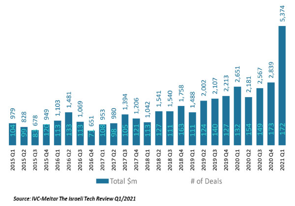 סך ההשקעות בהיי-טק הישראלי מהרבעון הראשון של 2015 ועד לרבעון הראשון של 2021. מקור: IVC-מיתר