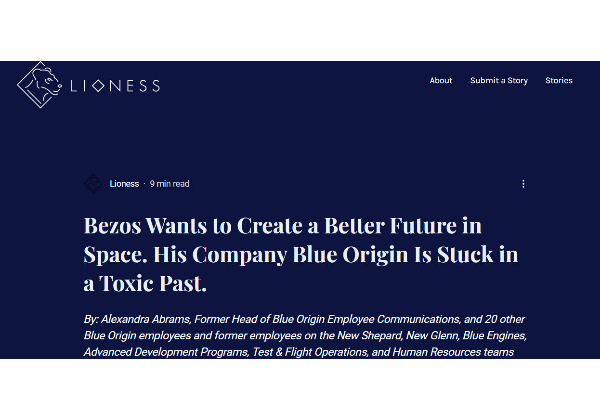 בלו אוריג'ין (Blue Origin) – חברת החלל של ג'ף בזוס – נתפשת כסיפור הצלחה. היא הטיסה בקיץ האחרון את החללית 'ניו שפרד' שלה לחלל, כשעל סיפונה ארבעה נוסעים בני אנוש, ביניהם הבוס הגדול והמולטי-מיליארדר שלה; מאוחר יותר החודש היא כבר עתידה לשלח עוד בני אדם לכוכבים, ונראה שהשמיים אינם הגבול שלה. אולם כעת מסתבר שמתחת לפני השטח רוחשים קולות ודברים אחרים לגמרי, שמעידים על תרבות ארגונית רעילה וסקסיסטית, שגורמת בין השאר לטנטים של החברה לנטוש אותה בזה אחר זה.