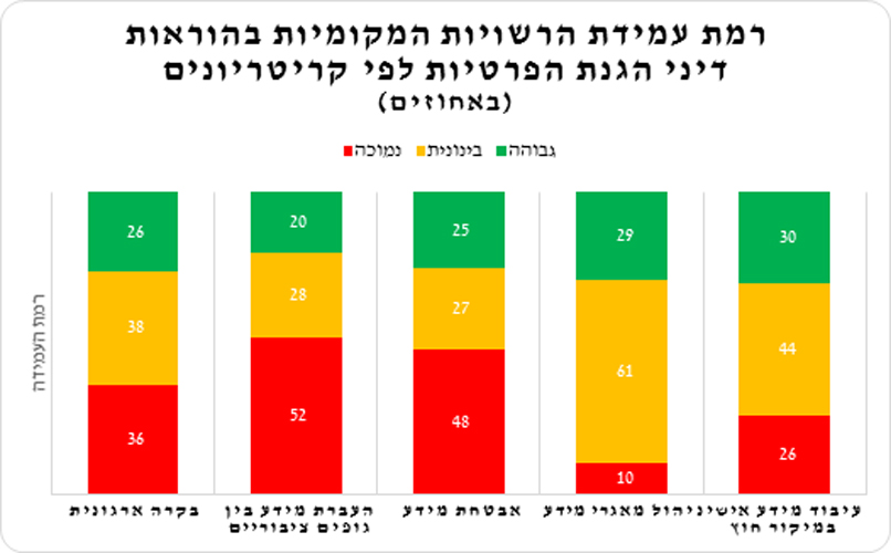 קרוב למחצית הרשויות שנבדקו, 48% מהן, עמדו ברמה נמוכה בהוראות חוק הגנת הפרטיות ותקנותיו בנושא אבטחת מידע. 27% מהרשויות המקומיות עמדו ברמה בינונית בתחום. על פי הרשות, "קיים יחס ישר בין גודל הרשות המקומית לבין רמת עמידתה באבטחת המידע". רמת העמידה של כרבע מהרשויות המקומיות הגדולות בהוראות החוק והתקנות הייתה נמוכה. ב-60% מהרשויות הבינוניות נמצאה רמת עמידה נמוכה, ובקרב הרשויות הקטנות 63% עמדו ברמה נמוכה. "רק 25% מכלל הרשויות המקומיות עמדו ברמה גבוהה בדרישות אבטחת המידע".