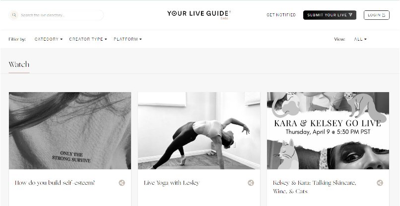 מאז פרוץ מגיפת הקורונה תוכן בשידור חי באינסטגרם שגשג. ההצלחה של השידורים החיים הללו גם קידמה יוזמות כמו Your Live Guide – מדריך לשידורי לייב, שחושף ומציג בפני משתמשים שידורים חיים שונים. לפי אתר היוזמה, "עם הפיצוץ והגידול של תוכן חי, קשה לעקוב אחר המשפיענים, היוצרים והמותגים האהובים עליך. במדריך הלייב שלך תוכל לחפש לפי ורטיקלים, לגלות תוכן חדש ולהוסיף תזכורות ליומן שלך".