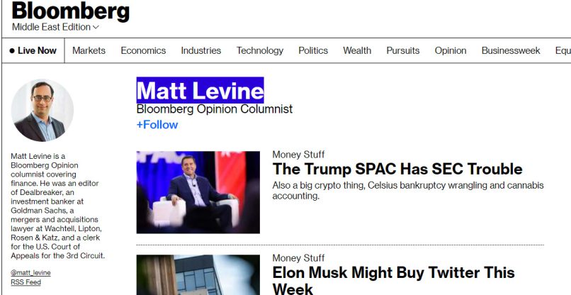 מאט לוין, הכתב הכלכלי החתום על הטור הפיננסי הפופולרי ב-Bloomberg Opinion. צילום: לכידת מסך מבלומברג