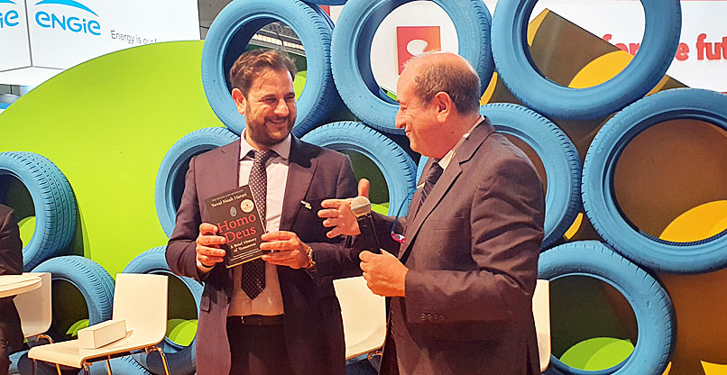 סרג'יו ויניצקי מעניק להוגו ולנטי עותק מספר של פרופ' יובל נוח הררי. צילום: מערכת אנשים ומחשבים