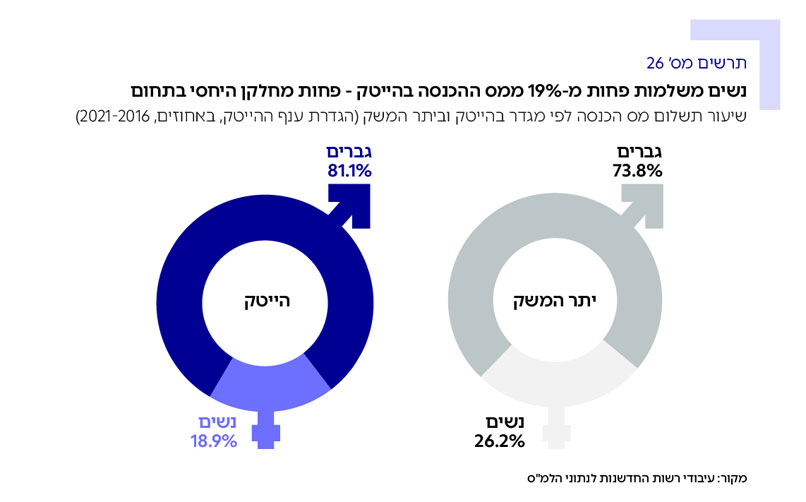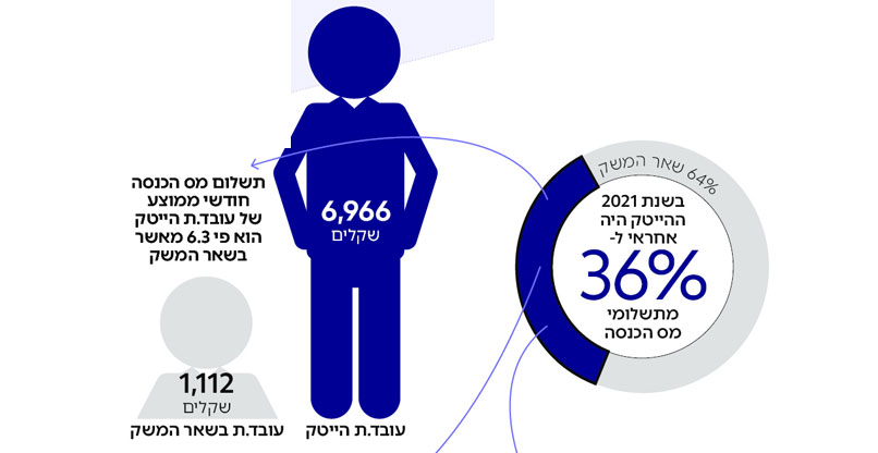 עוד עולה מהנתונים כי 57% מתשלומי המסים של עובדי היי-טק ב-2021 הגיעו מהקבוצה הדומיננטית בענף: גברים יהודים שאינם חרדים. נשים משלמות פחות מ-19% ממס ההכנסה של עובדות ועובדי הענף – פחות מחלקן היחסי בתחום (כשליש). עובדת היי-טק שילמה ב-2021, בממוצע, 3,508 שקלים בחודש – פי שישה מעובדת בענפים אחרים במשק, ששילמה 583 שקלים. 97.1% מהתרומה של הענף לתשלומי מס ההכנסה ב-2021 הגיעו מעובדים ועובדות יהודים שאינם חרדים – שיעור השקול ליותר מ-21 מיליארדי שקלים. האזורים בארץ שהעובדים בהם שילמו את סכומי המס הגבוהים ביותר הם תל אביב והדרום.