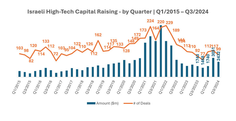 הנתון עלה ב-40% ברבעון השלישי ל-2.43 מיליארד דולר, לעומת זינוק של 48% ברבעון השני - כך לפי נתונים של IVC ולאומיטק ● בנטרול העסקאות הגדולות, מדובר בעלייה של 5% בלבד ● הסייבר ירד מ-62% ל-14% מהגיוסים