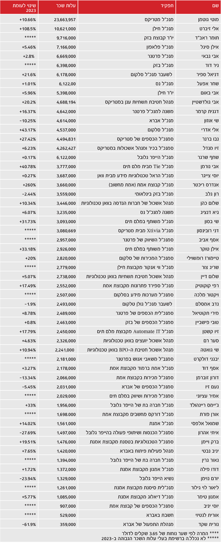 כאמור, מוטי גוטמן הוא שיאן השכר בחברות ה-IT הבורסאיות גם השנה, כפי שקורה כבר שנים רבות – מה שאומר שהימצאותו בצמרת הדירוג היא לא הפתעה. במקום השני נמצא אלי זיברט, מנכ"ל חילן, עם עלות שכר יותר מכפולה לעומת 2023 – העלייה הגבוהה ביותר ב-2024. אחריו נמצאים שלושה שעומדים בצמרת חברות התקשורת המובילות – תומר ראב"ד, יו"ר בזק, במקום השלישי, אילן סיגל, מנכ"ל פלאפון, במקום הרביעי, ואבי גבאי, מנכ"ל פרטנר – בחמישי.