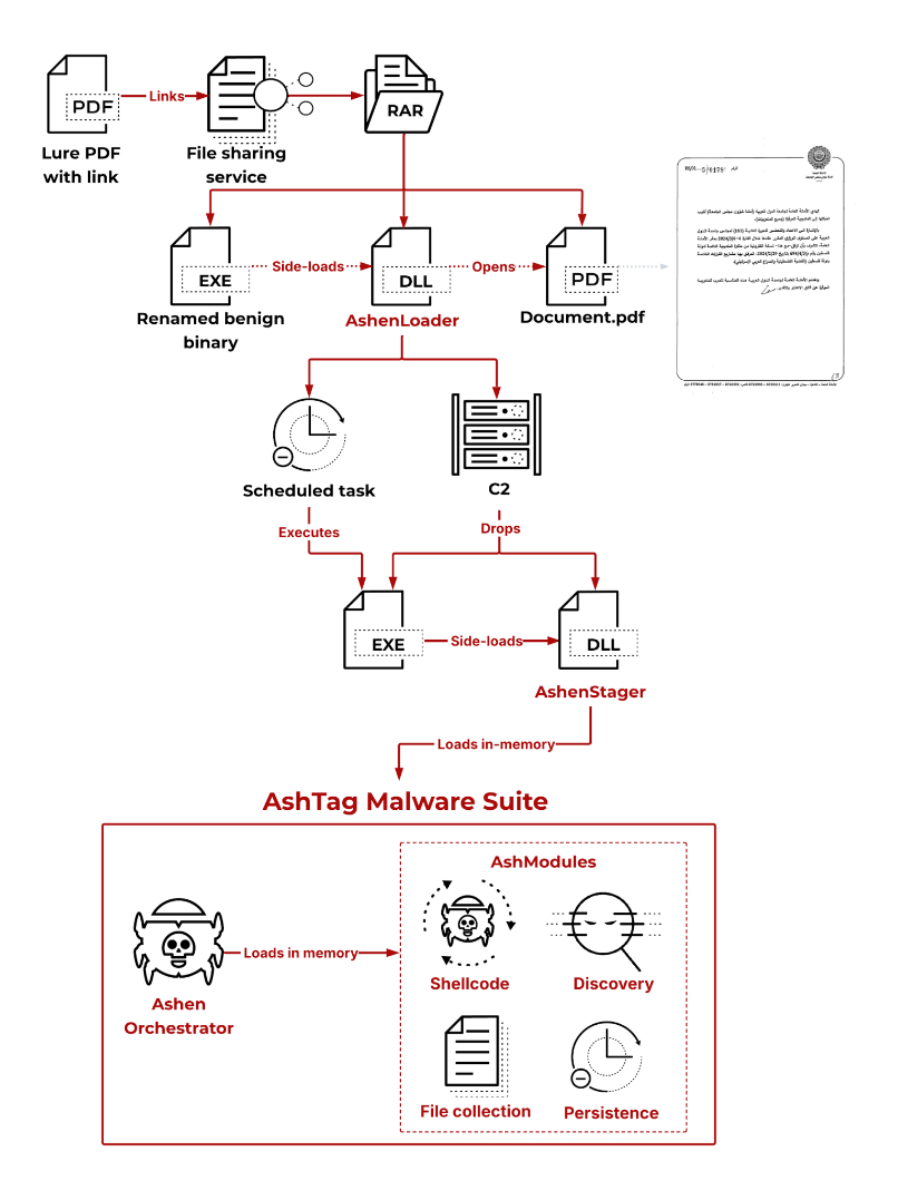 לדברי החוקרים, במהלך החודשים האחרונים פתחה הקבוצה במתקפה חשאית ורחבת היקף נגד גורמי ממשל ודיפלומטיה במדינות שונות במזרח התיכון – ביניהן עומאן, מרוקו, מצרים, ירדן והרשות הפלסטינית, במטרה לאסוף מודיעין רגיש. הקבוצה פיתחה גרסאות חדשות לכלים הקיימים שלה והפעילה מערך תקיפה חדש בשם AshTag, לצד תשתיות שליטה ובקרה משודרגות, שנועדו לחמוק מגילוי ולהידמות לתעבורת אינטרנט לגיטימית. פעילותה של Ashen Lepus הייתה מתמשכת ועקבית גם במהלך מלחמת ישראל-חמאס, ואף לאחר הפסקת האש באוקטובר 2025. זאת, בניגוד לקבוצות תקיפה אחרות שהאטו או עצרו פעילות בתקופה זו.