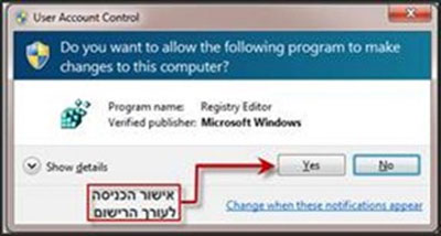 נקליק על כפתור "התחל" במערכת ההפעלה ובשורת החיפוש נכתוב את הפקודה Regedit ונקליק על מקש Enter במקלדת (במערכת ההפעלה Windows XP נבחר ב-"הפעלה" ושם נקליד את הפקודה Regedit). במערכות ההפעלה חלונות ויסטה (Windows Vista) וחלונות 7 (Windows 7) מצריכה פעולה זו אישור מנהל ולכן נאשר את הפעולה בחלון הבא: