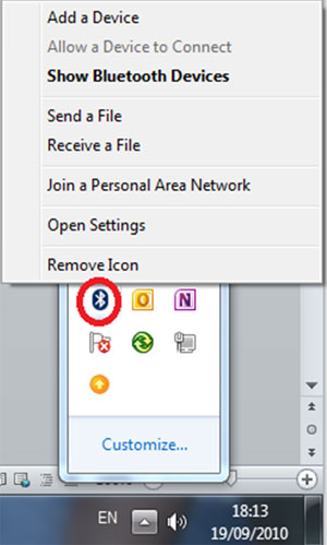 2. בלחיצה על הסמל באמצעות המקש הימני של העכבר, נוכל לראות את האפשרויות המוצעות לנו בשימוש בטכנולוגיה זו. ניקח, לדוגמה, אפשרות של הוספת טלפון סלולרי התומך בטכנולוגיית בלוטות'. לפני ביצוע פעולה זה נצטרך לוודא, כי המכשיר אותו אנו מעוניינים לחבר נמצא במצב "Discovery mode" (גלוי לכל), בכדי שמשדר הבלוטות' ידע למצוא אותו.