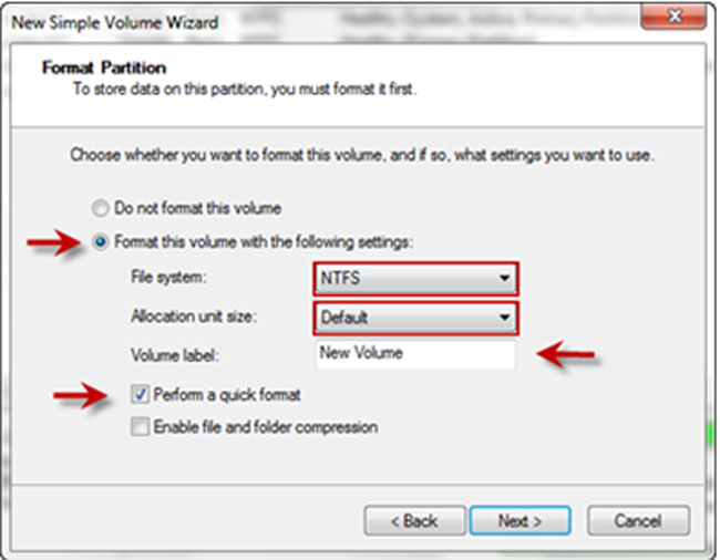 9. בחלון זה נאתחל את המחיצה ונבחר את מערכת קבצים הרצויה. תמיד נבחר באפשרות של NTFS, שכן זוהי מערכת קבצים המתקדמת ביותר. כעת נבחר את שם הכונן ונלחץ על הבא.