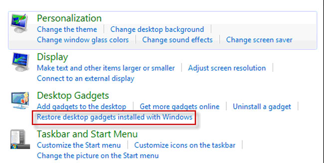 4. תחת הכותרת Desktop Gadgets (גאדג'טים של שולחן העבודה) בחרו ב-Restore desktop gadgets installed with Windows (שחזר גאדג'טים שהותקנו עם Windows).