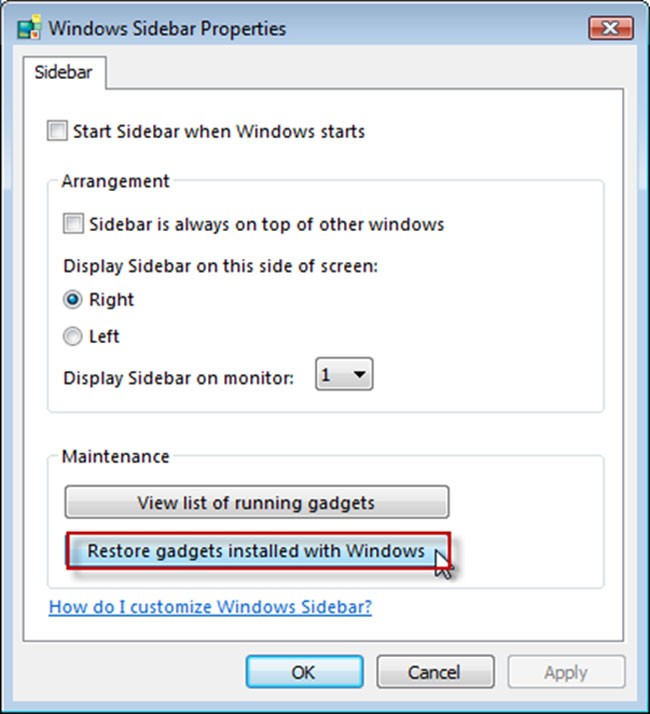 5. בחלון שנפתח לחצו על Restore Gadgets installed with Windows (שחזר גאדג'טים שהותקנו עם Windows).