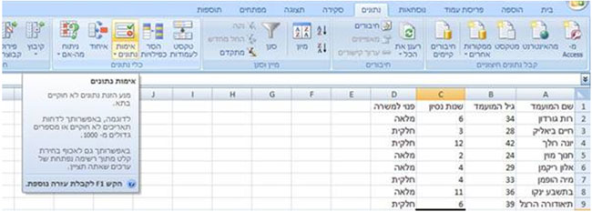 ניקח לשם הדוגמה גיליון עבודה ובו רשימת מועמדים. עמודה עם שם המועמד או המועמדת, גיל, שנות ניסיון והיקף המשרה הרצויה. כעת, נחליט שנרצה לקבל לעבודה אך ורק מועמדים עם חמש שנות ניסיון ומעלה. נרצה שאקסל יתריע בכל פעם שנכניס פרטיו של מועמד שאינו עומד בקריטריון. נסמן את התאים בעמודת שנות הניסיון. נקיש על נתונים ומשם נלחץ על כפתור אימות נתונים בסרגל העליון.