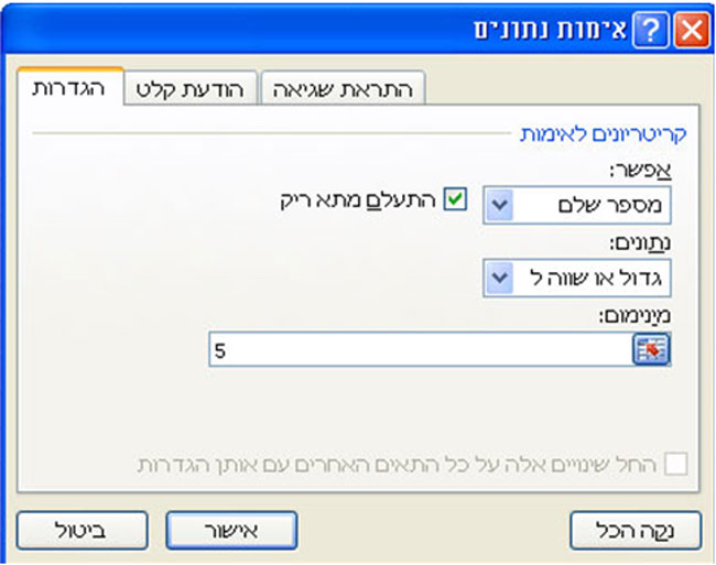 במסך אימות הנתונים נבחר מספר שלם תחת תפריט אפשר (ברירת המחדל היא כל ערך). נבחר גדול או שווה ל- תחת תפריט הנתונים ו-5 תחת תפריט מינימום.