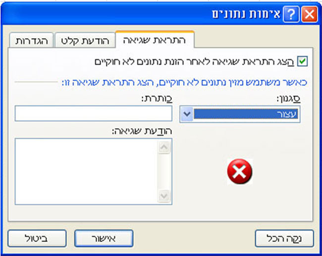 כעת נבחר בלשונית התראת שגיאה, שתאפשר לנו לבחור בין שלושה סגנונות – עצור, אזהרה ומידע. עצור לא יאפשר לנו להכניס ערך בעמודה שקטן מ-5 שנים, אזהרה ומידע יאפשרו להכניס כל ערך אולם יקפיצו הודעת שגיאה בכל פעם שנכניס ערך הקטן מ-5 בעמודת שנות ניסיון. נוכל גם לבחור את כותרת הודעת השגיאה ואת תוכנה ובכל פעם שננסה להקליד מספר הנמוך מארבע בעמודת הניסיון, תוקפץ הודעת שגיאה עם הכותרת והתוכן שקבענו.