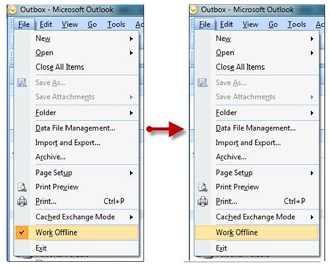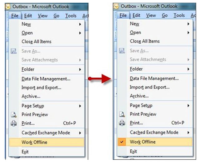 על מנת לפתור את הבעיה בצורה הפשוטה ביותר, עלינו להגדיר לתוכנה לעבוד במצב לא מקוון. נבצע זאת על ידי לחיצה על קובץ => עבוד בצורה לא מקוונת