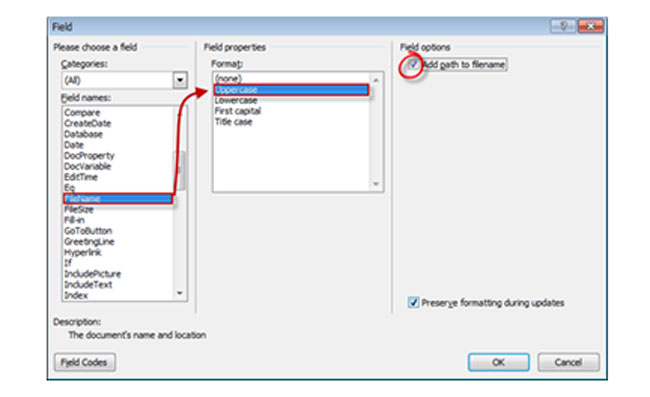 שימו לב כי בחרנו את השדה, לאחר מכן בחרנו את עיצובו ובשלב האחרון בחרנו באפשרות "הוסף נתיב לשם קובץ" כף שבפועל יתווסף נתיב השמירה של הקובץ ברגע שנשמור את המסמך.