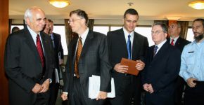 מימין: ארז יקואל, ניצב בדימוס, ראש אגף תמיכה לוגיסטית; חמי פרס, מייסד ושותף קרן VC פיטנגו; צבי זיו, מנכ"ל בנק הפועלים; דני ימין, מנכ"ל מיקרוסופט ישראל; ביל גייטס, בכבודו ובעצמו;  ישראל מקוב, מנכ"ל חברת טבע.