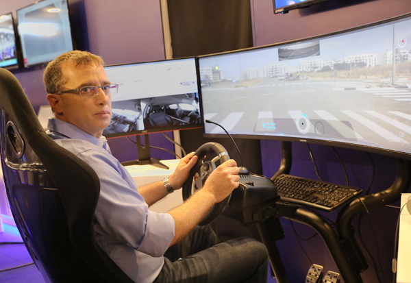 רן גוראון, מנכ"ל פלאפון, מתנסה בנהיגה מרחוק ברכב אוטונומי. צילום: רפי דלויה