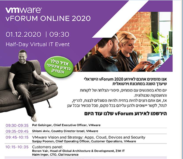 VMware תציג באירוע vForum, שייערך ב-1 בדצמבר, את כל החידושים, ההכרזות והפתרונות החמים מכנס VMworld 2020. את האירוע יפתחו פט גלסינגר, מנכ"ל VMware העולמית, סנג'יי פונן, סמנכ"ל התפעול של החברה, ושלומי אביב, מנכ"ל VMware ישראל. בכנס יתקיים פאנל לקוחות, שישתפו את אלפי המשתתפים באירוע הווירטואלי כיצד הם ביצעו את המעבר הדיגיטלי בהצלחה, ויהיו בו מסלולים טכנולוגיים מקצועיים, בהובלת מיטב מומחי החברה ושותפיה בישראל. את האירוע יחתום אדיר מילר בראיון אינטימי ומצחיק עם הקהל בבית.