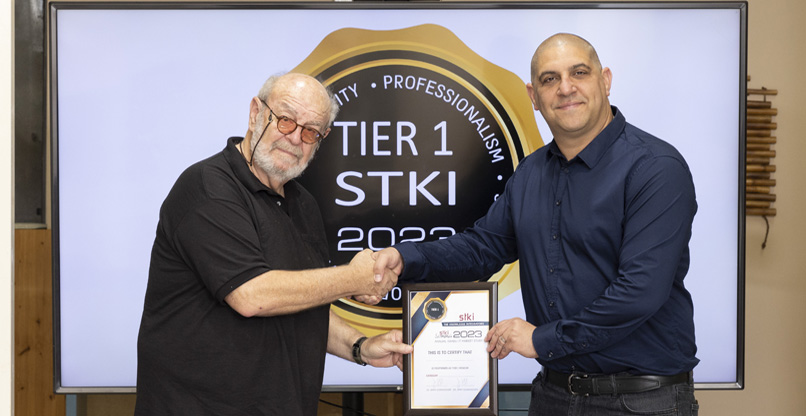 קובי מזרחי, מנהל מחלקת השיווק של בזק בינלאומי (מימין), מקבל את תעודת ההסמכה מד"ר ג'ימי שוורצקופף, מייסד ומנכ"ל STKI. צילום: STKI